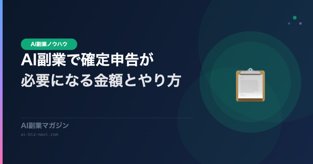 AI副業を始めたら気になるのが税金の問題。「いくら稼いだら確定申告が必要なの?」「どうやって申告するの?」この記事ではAI副業と確定申告の基礎知識から具体的な手続き方法まで、税金の専門用語をわかりやすく解説します。 ⚠️ 免責事項 本記事は一般的... -
